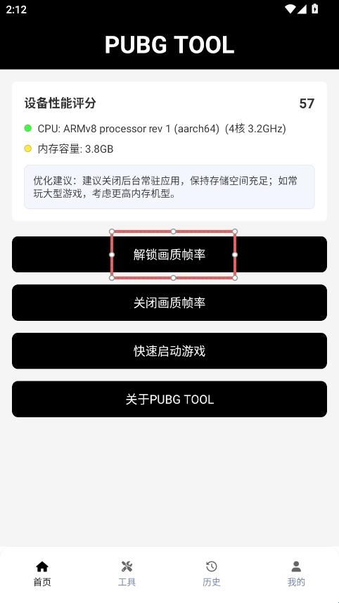 1、打开pubgtoll画质助手,点击【解锁画质帧率】,