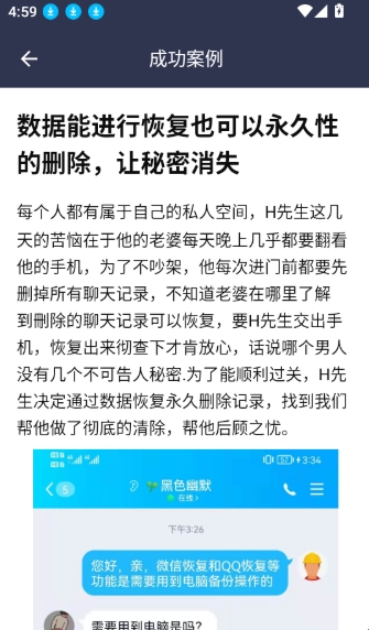 手机恢复数据管家大师是一款专为用户提供强大的手机数据恢复功能,该软件可以有效的帮助用户进行像文件恢复,照片恢复等一系列的回复功能,而且用户还可以根据自己的需求进行选择恢复的数据内容,且为用户提供了诸多成功的线上成功案例,供用户群体进行了解和查看。如果有对这款软件感兴趣的小伙伴,那就快来下载试试吧!