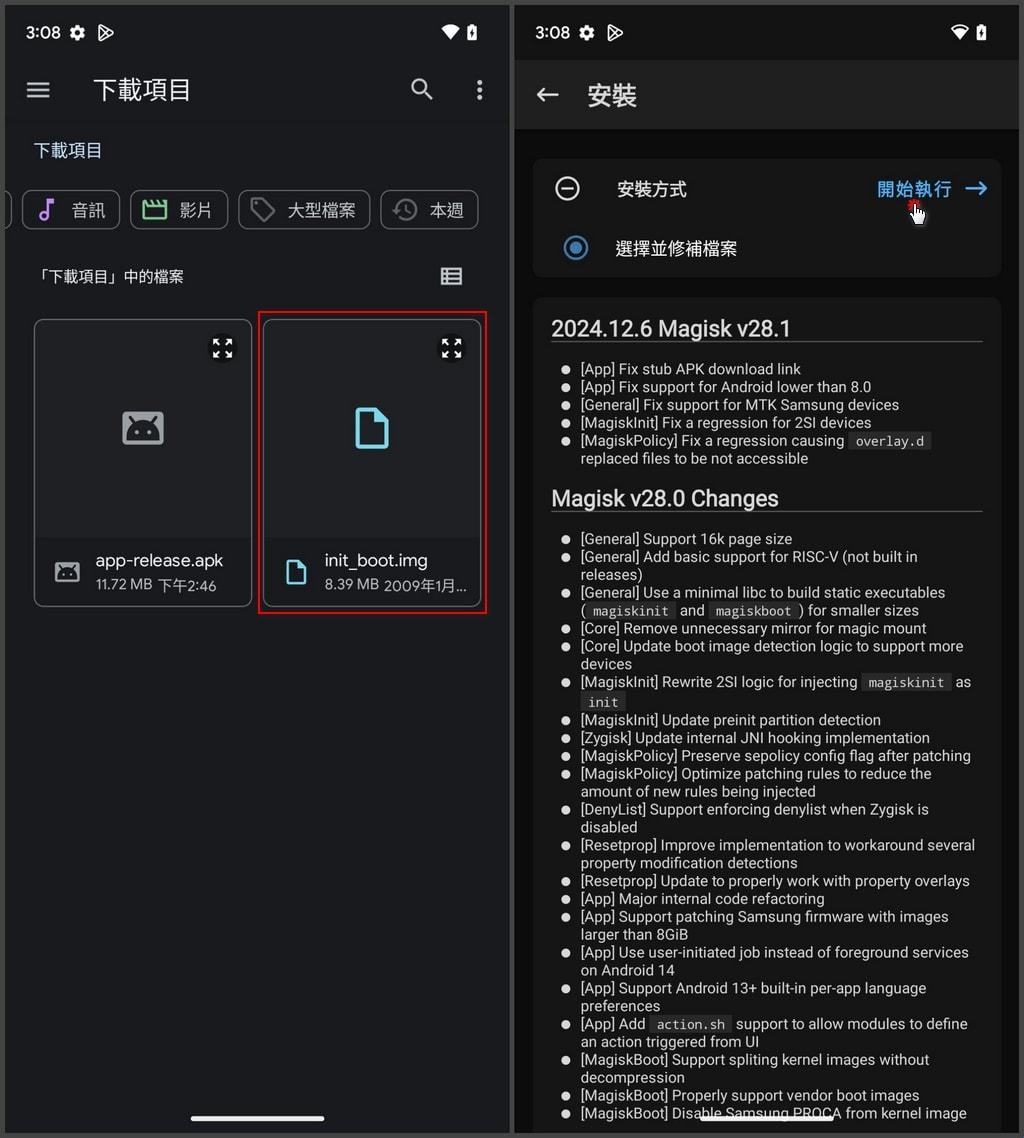 2、选择从固件包中提取并上传至手机的 init_boot.img,点击「开始执行」(请参考固件提取说明,将 init_boot.img 上传至手机中的 Download 文件夹,供 Magisk 选择使用)