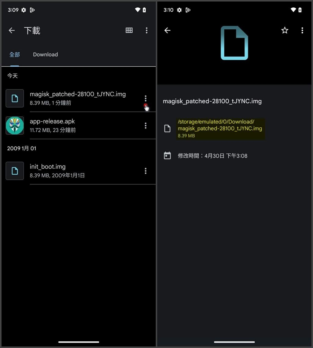 4、点击 magisk_patched-28100_tJYNC.img 查看「档案资讯」,不熟悉的使用者可以将档案路径记录下来