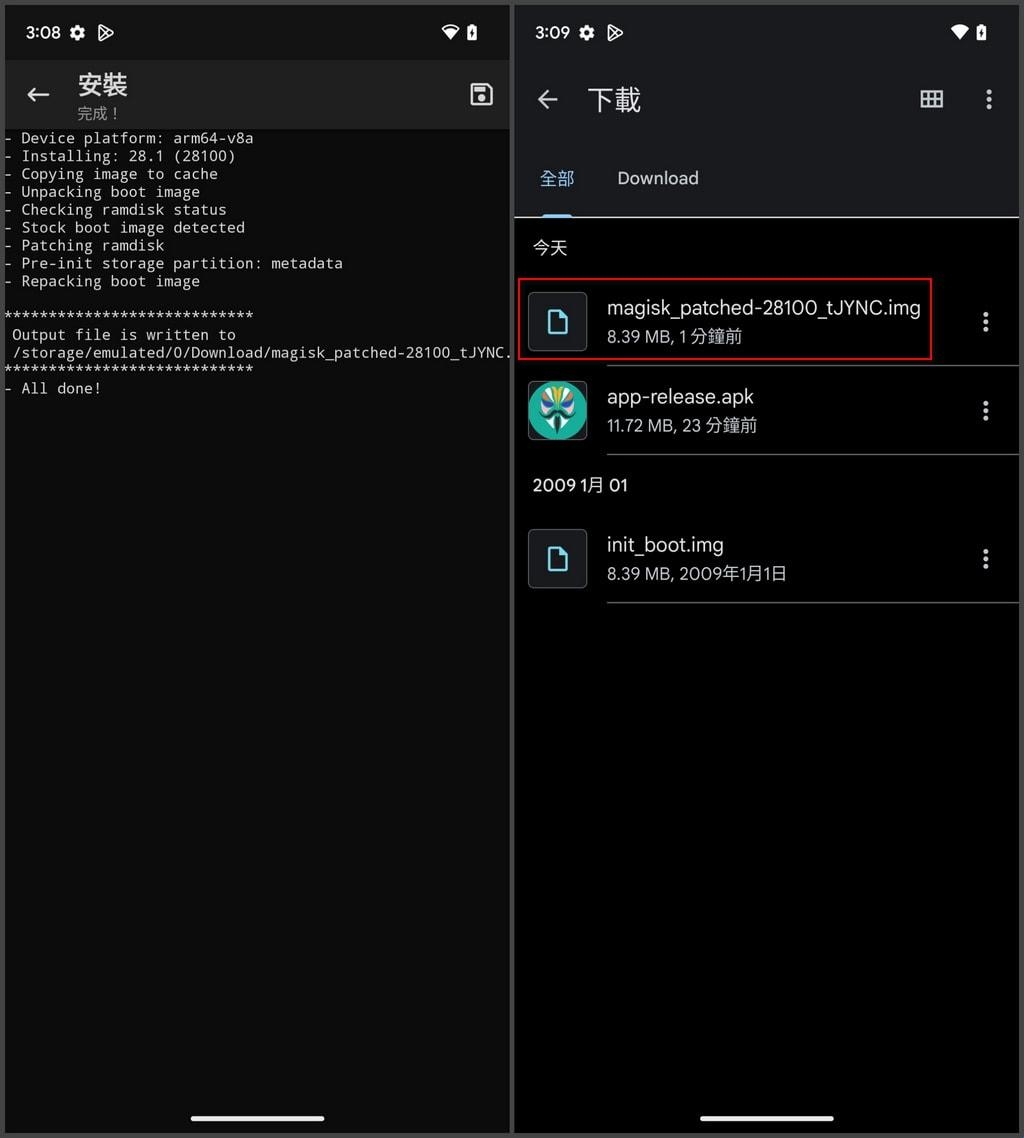 3、Magisk处理完成后,在手机下载资料夹处,会多出一个修复完成的启动映像档,档名格式为 magisk_patched-版号_[随机字串].img