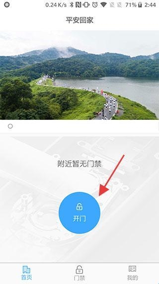 3、平安回家APP首页,显示风景图,提示附近暂无门禁,有开门按钮,底部是首页、门禁、我的导航栏。