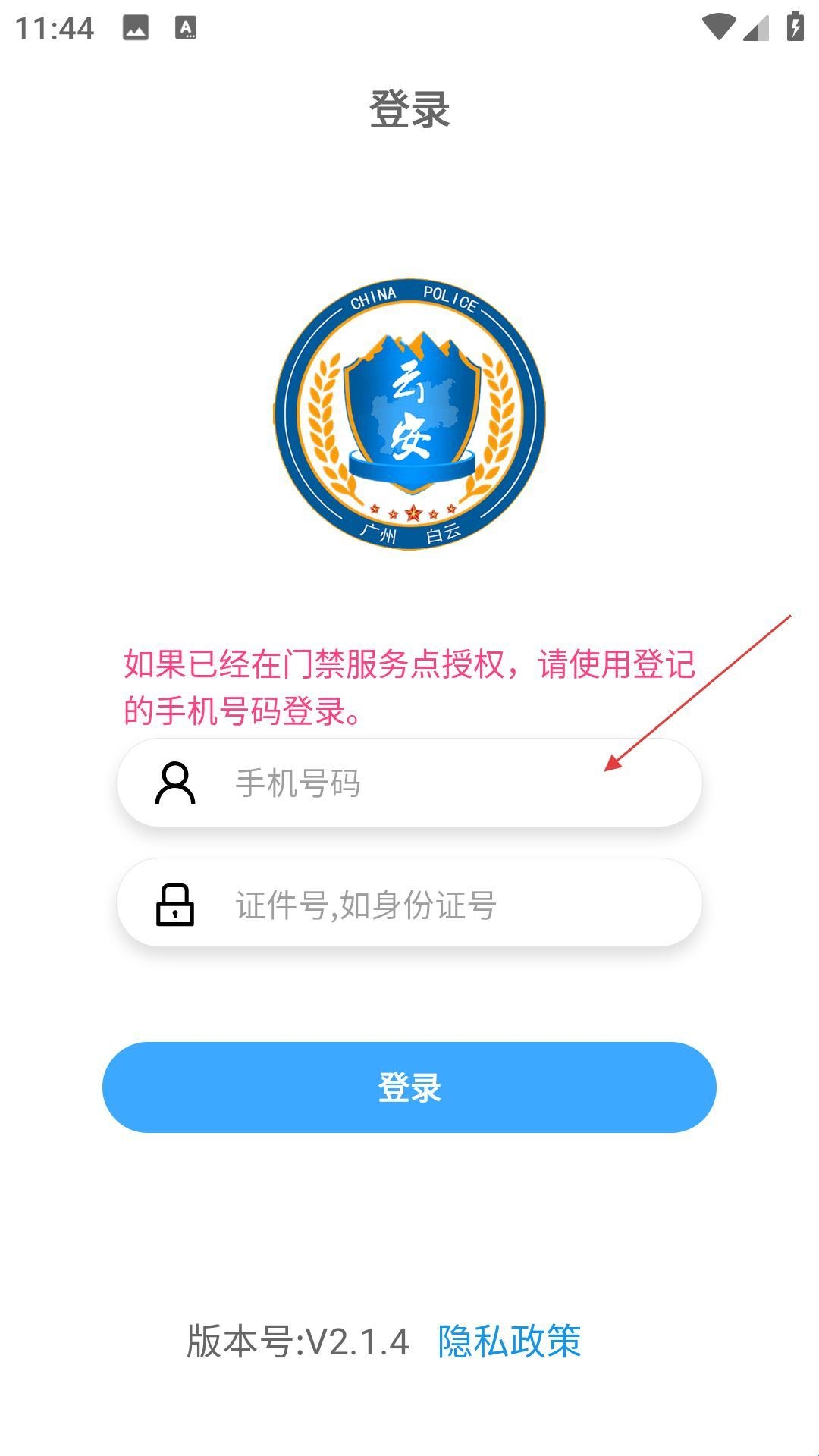 2、登录页面,提示授权后用登记手机号登录,需填手机号码、证件号,点登录进入,底部有版本号和隐私政策。