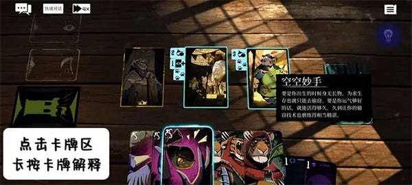 1、每张牌的左上角都有小标志,长按卡牌预览效果时可以帮助你快速了解对应信息。