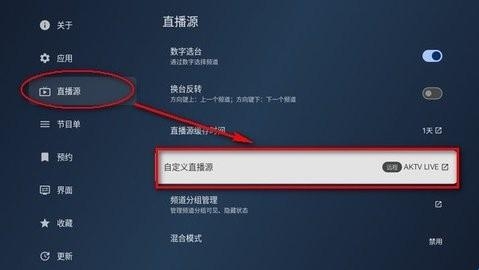 3、进入设置页面后,选择“直播源”,并点击其中的“自定义直播源”,如图所示;