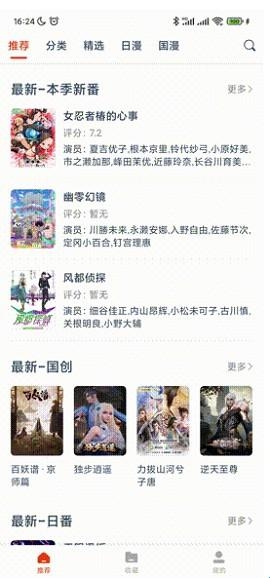 2、分类页面,比较简洁,就只有几个日漫、国漫、剧场这些分类,然后还有更新、热门、评分、最新、推荐。