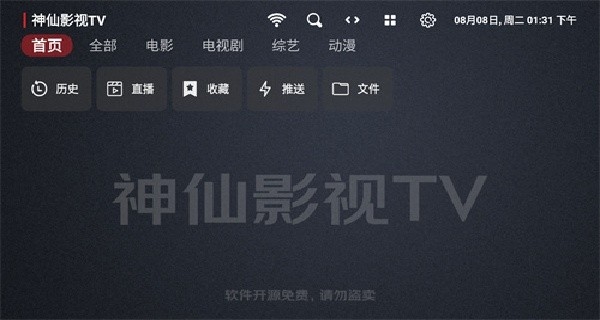 1、在电视上打开神仙影视TV版,进入应用点击左上角放大镜按钮