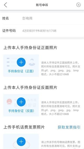 3、按步骤依次上传身份证正反面照片和手机话费发票照片;确认手机号码是否正确后获取验证码,进行下一步;
