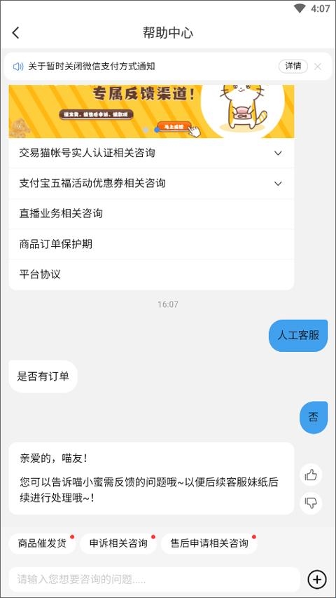 3、然后在下方聊天框输入“人工客服”;