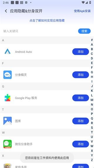 2、然后来到应用隐藏&分身双开的页面中我们选中应用后点击【添加】;