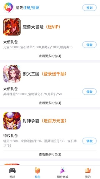 3、礼包页面:用户可以在这里领取各种游戏的礼包;