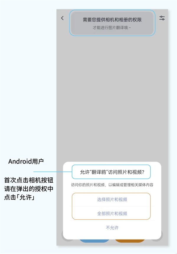 2、Android用户请在弹出的相册界面中选择对应的图片,或者选择相机按钮进入拍照页面 *首次点击相机按钮的Android用户,请在弹出的相册和相机授权过程中点击允许,给到相应的权限才能上传图片进行翻译哦~*