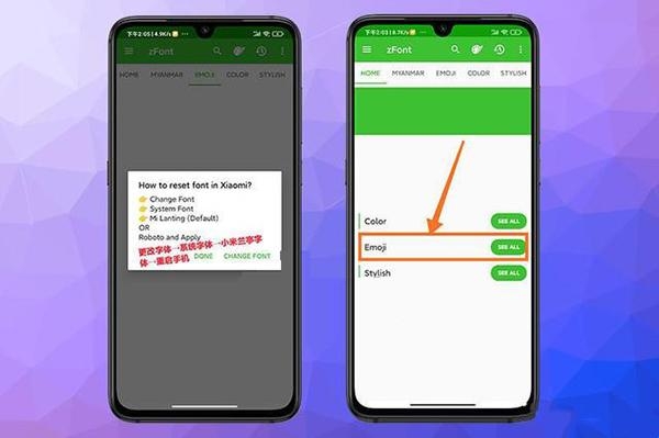 4、重启后重新打开zfont,点击Home页面 ,选择emoji,再点击See All(看全部),按照这个流程操作之后,zfont的emoji表情包就已经可以正常使用。
