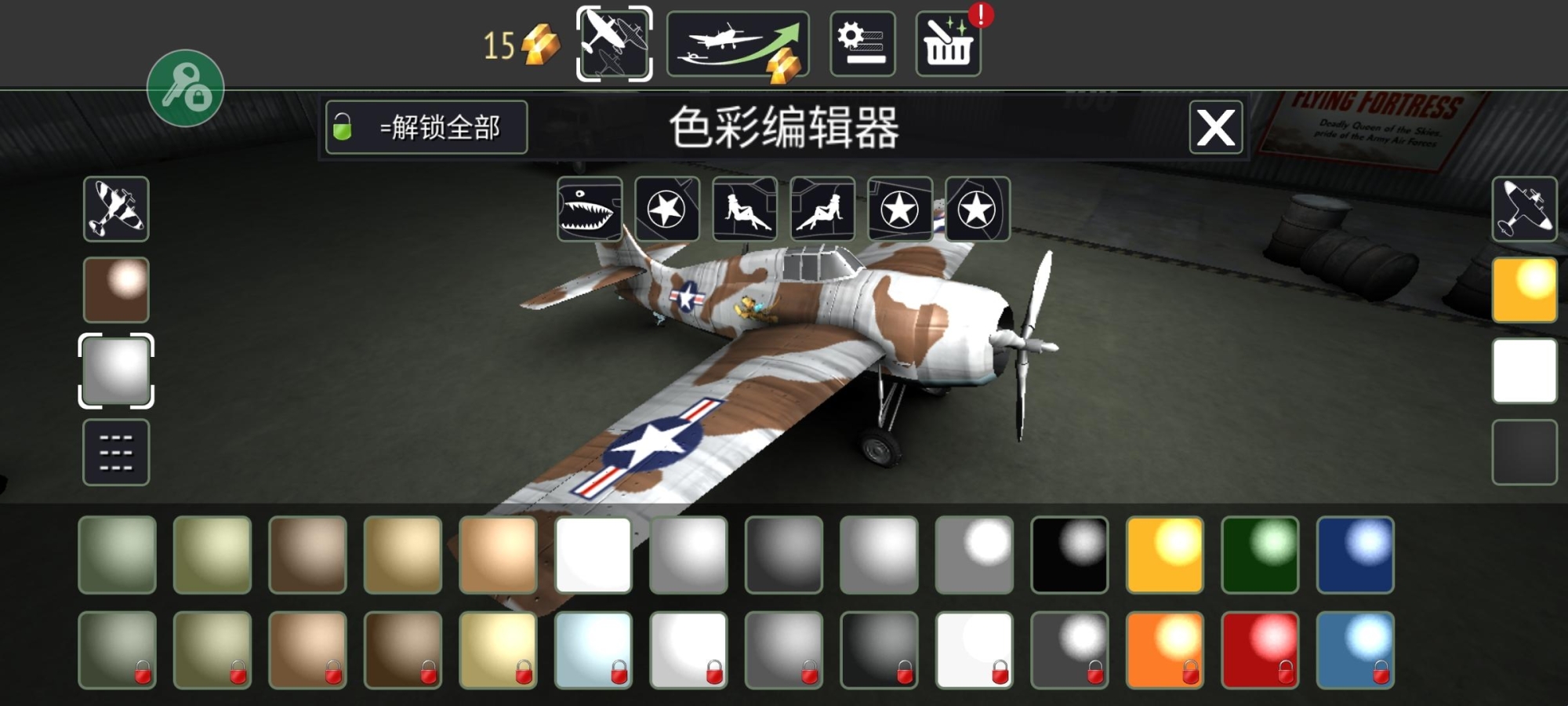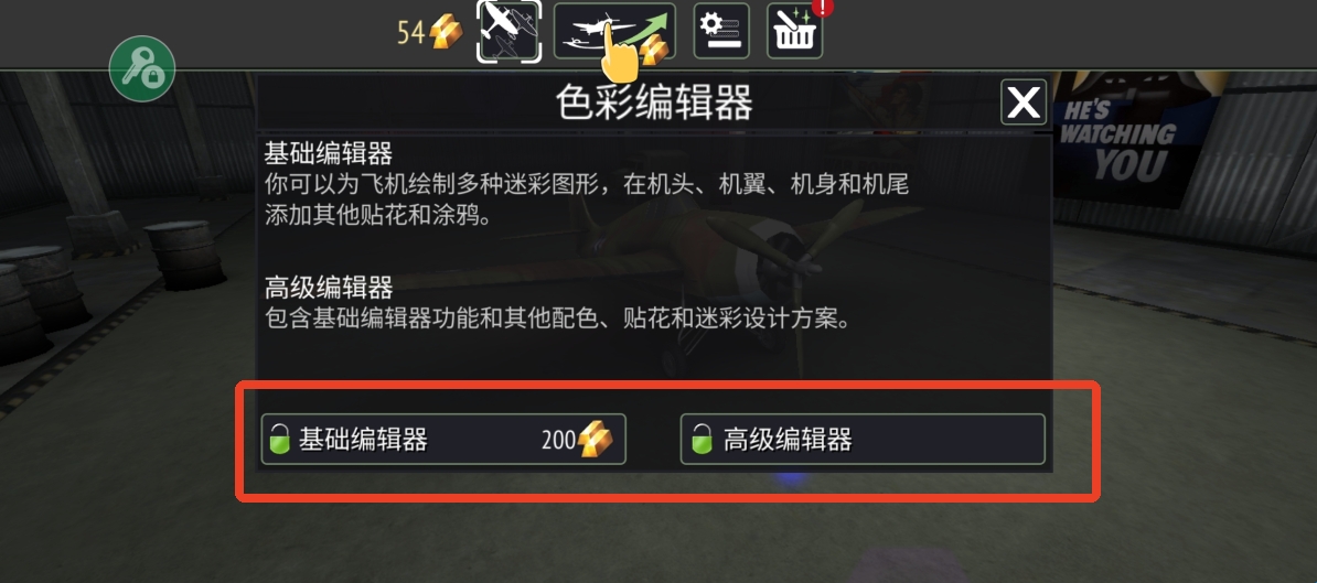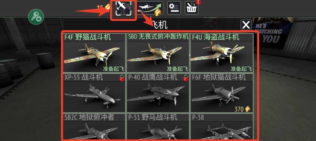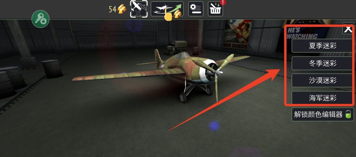 1、点击上方第一个选项可以进入机库,选择一架你想要改变颜色的飞机。完成前期的任务后会解锁机库,可以查看目前你拥有的飞机,或者解锁飞机。