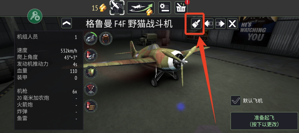 2、在飞机名字的右边有一个刷子图形的标志,点击就能更换飞机上的颜色的图案。