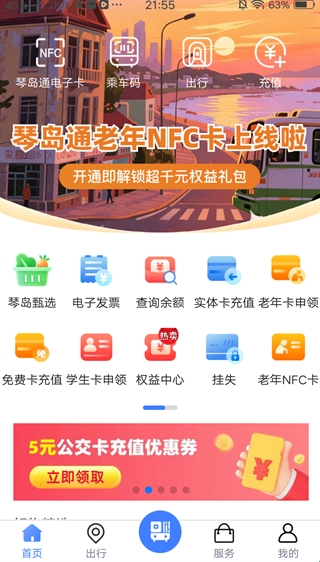 3、首页中有清晰的服务内容,无论是NFC卡的快速开通、余额的即时充值,还是二维码乘车的无缝切换,都能轻松找到所需服务。