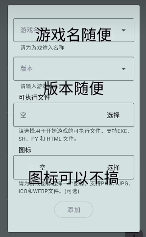3、这里的游戏名,版本都可以随便填,图标可以不填。