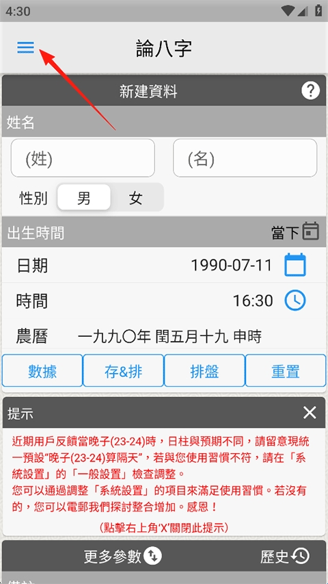 4、返回到首页,输入您要测试的姓名,性别及出生日期,点击存&排;