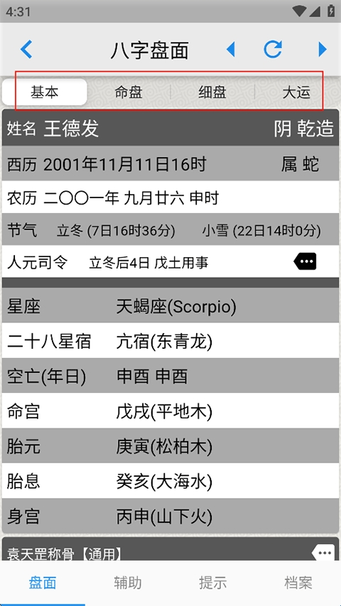 5、上方提供了命盘、细盘、大运等运势类型,下方还有盘面、辅助、提示和档案功能。