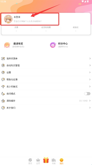 2、前往我的页面,可见“未登录”状态,点击此处完成登录并能管理个人资料。
