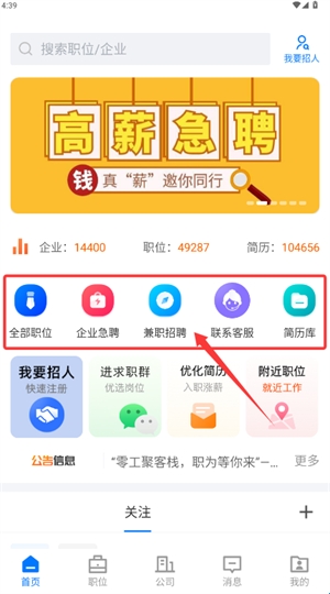 1、登录应用首页,可见急聘专区、全职岗位等入口,按需选择功能模块。