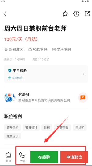 3、选定岗位后进入详情页,支持电话沟通、在线聊天或一键投递简历。