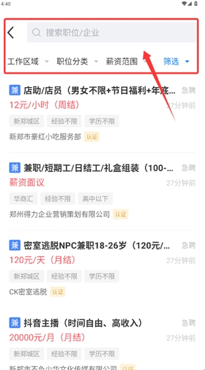 2、进入兼职频道,通过区域、薪资等筛选条件快速定位合适的工作机会。