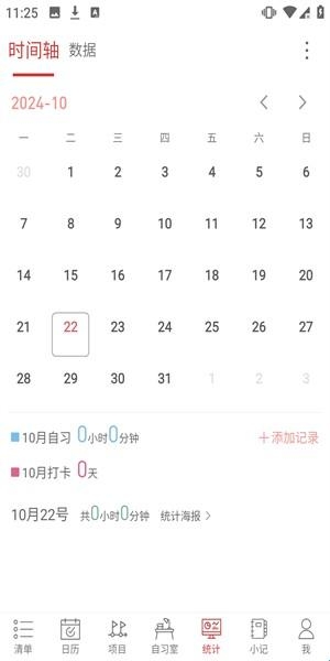4、在统计这里可以记录自己的每天自习的时间、打卡时间。