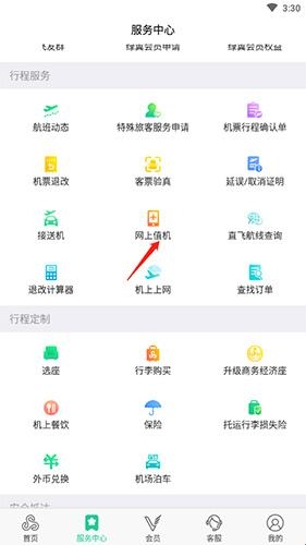2、进入服务中心页面,点击“网上值机”。如果你已经购买机票,即可进行值机操作。