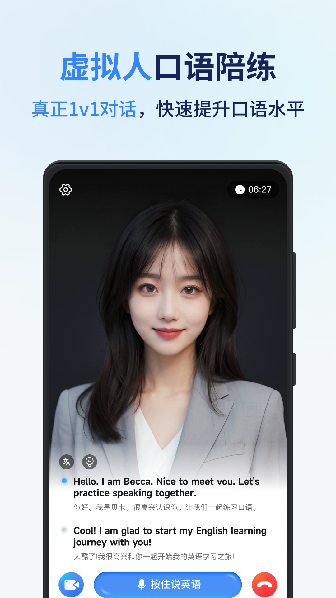 3、虚拟人口语陪练通过利用先进的人工智能技术,模拟真实对话环境,为学习者提供与虚拟角色进行口语交流的机会。发音标准纯正,美式及英式口音兼备。通过与虚拟角色的互动,学习者可以锻炼英语口语表达能力,提高语言应用水平。
