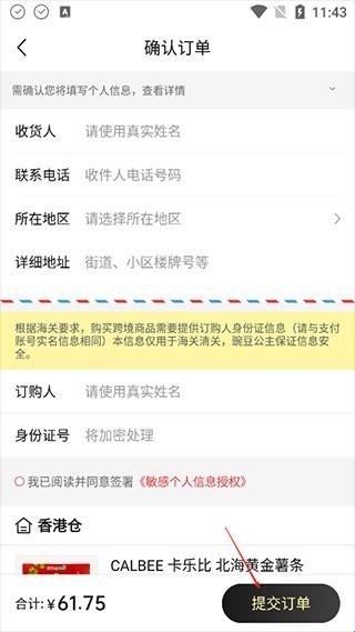 4、准确填写收件地址与身份证信息后提交订单完成跨境购买。