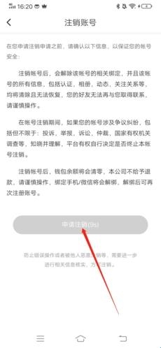 4、查看注销账号相关的内容后,等待下方倒计时结束后,点击“申请注销”;