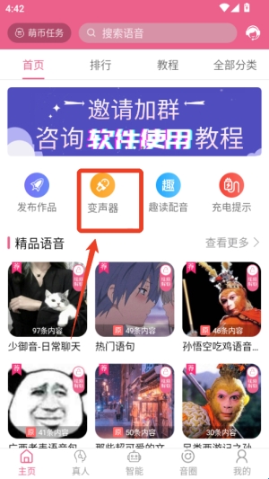 1、打开萌配音变声器后,先试听首页推荐的各类语音包,比如搞怪、萌系或成熟声线,找到符合你风格的声音类型。