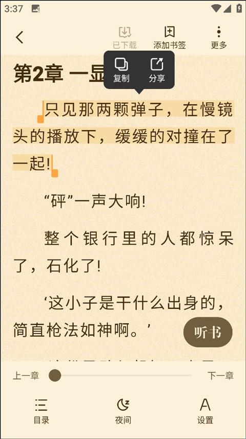 6、在阅读小说的时候发现精彩的故事内容,可以通过添加书签将章节进行标记