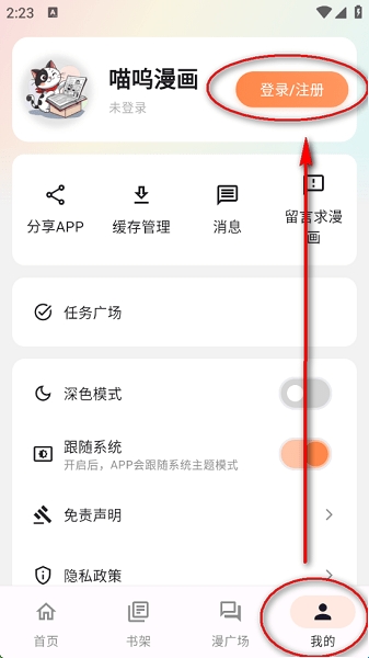 1、打开喵呜漫画app后,点击右下角“我的”,再点击右上角的“登录/注册”,可以注册账号;