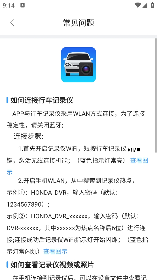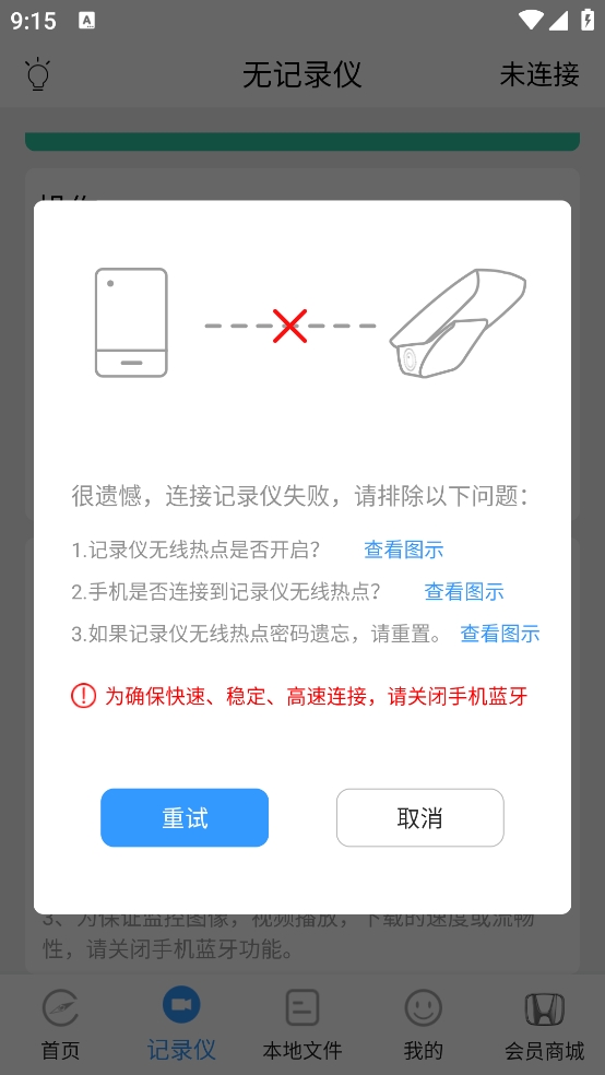 如果通过上述的方法还是没能解决的话,那么在启动车辆的状态下试一下能不能连接,因为在车辆未启动之前wifi的连接并不是很稳定;还有可能是车上的开着 蓝牙 或者是手机上开着移动数据对wifi信号造成了干扰,关掉蓝牙及数据重新试一下。如果试过这些方法都不行的话,试一下重启手机wifi或行车记录仪wifi。