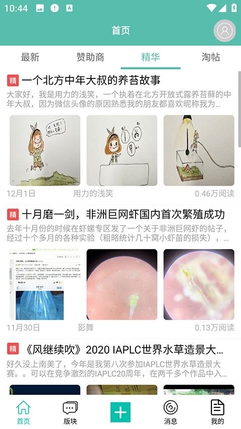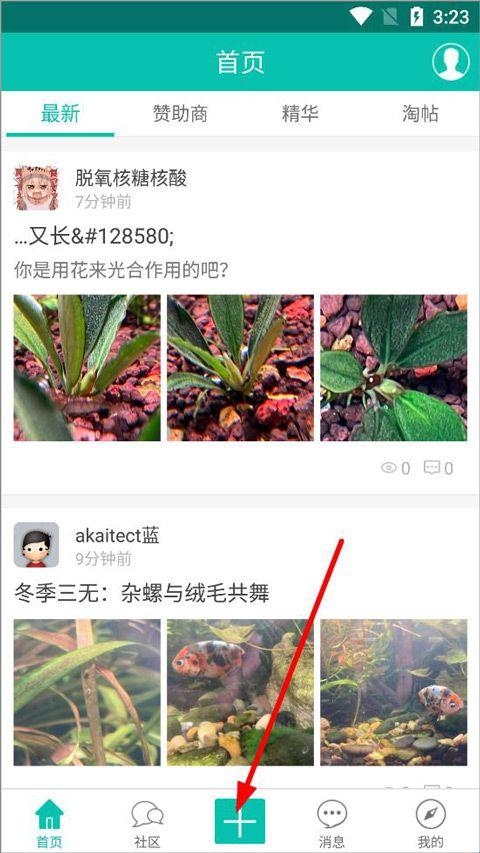 1、打开南美水族论坛app,登录进入首页,首页可以查看最新的水族交流讯息,点击页面中的“+”;