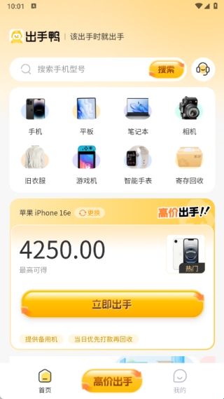 出手鸭是一款在线二手设备回收软件,如果您也有二手的手机、平板、电脑或者其他电子设备都是可以在此平台回收的哦,只需要您填写地址,预约上门时间,就会有专门的质检师来进行上门回收,而且手机在出售之前就可以在线估价,让您能够对自己手机的价格有一个大概得区间,需要的朋友一起来下载吧!
