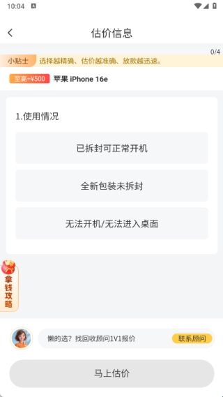 2、选择你的机型后点击立即出手,在估价信息中可以描述使用情况,然后点击马上估价;