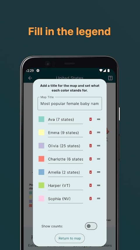 1、为你的世界着色:选择你最喜欢的颜色并开始绘制你的地图。向地图添加图例、更改其背景或使用图案。简单又有趣!
