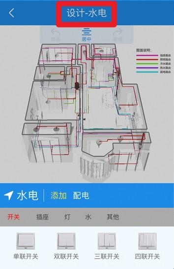 4、在【设计-水电】功能中,可以直观查看房屋的水电布线情况,并可进行开关、插座、灯具、水路等添加与配置。