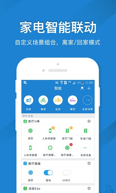 4、家电智能联动,自定义场景组合,离家/回家模式