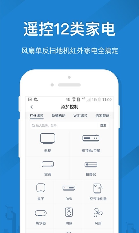 3、遥控12类家电,风扇单反扫地机,红外家电全搞定