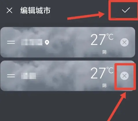 3、长按任意城市名称,待出现×图标时点击该图标,然后点击右上角的【√】确认,即可完成城市删除操作。