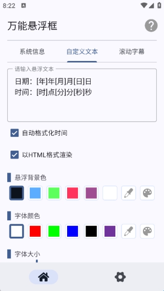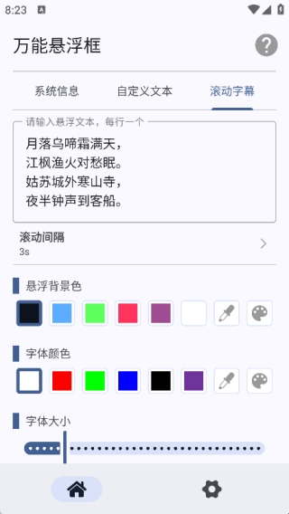 万能悬浮框是一款可以进行自由设置悬浮效果的软件,软件的操作十分简单,他可以自定义文本以及滚动字幕, 能够了解不同的特色信息,显示系统时间、手机实时电量、cpu的温度以及内存的占比度等等,非常的实用,喜欢的盆友一起来下载吧!