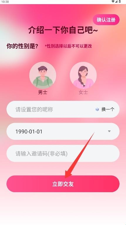 2、完善个人资料信息包括性别、昵称等基本资料,完成设置后即可开始交友互动。