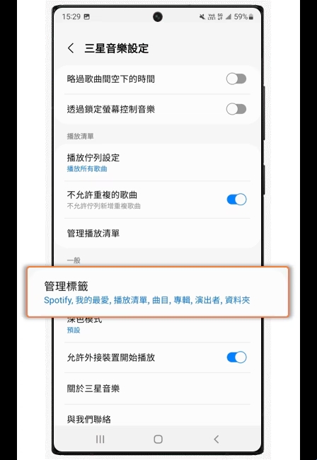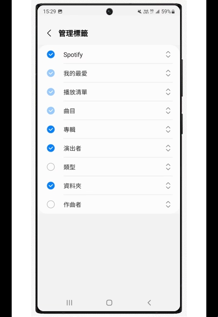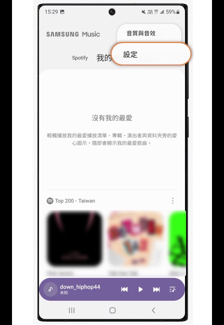 5、三星音乐显示来自Spotify的播放列表推荐。您可以通过 Spotify 标签找到 Spotify 推荐音乐并搜索您喜欢的 Spotify 音乐。(Spotify 选项卡仅在提供服务的国家/地区可用。)