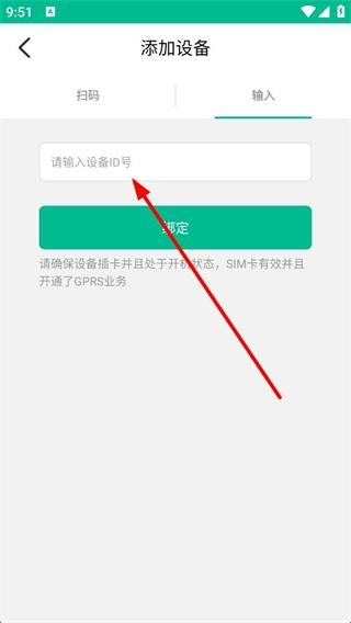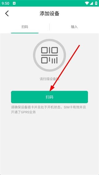 1、进入添加设备页面,默认选中扫码选项,可点击页面中的扫码按钮来扫描设备二维码,操作前需确保设备插卡开机且SIM卡有效并开通了GPRS业务。