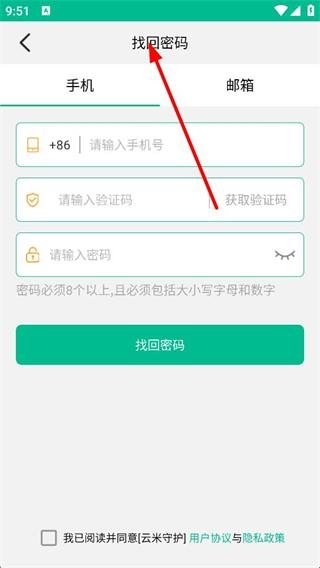 4、进入找回密码页面,选择手机方式,对应输入框填写手机号,获取并输入验证码,设置符合要求的密码,勾选协议后点击找回密码按钮。