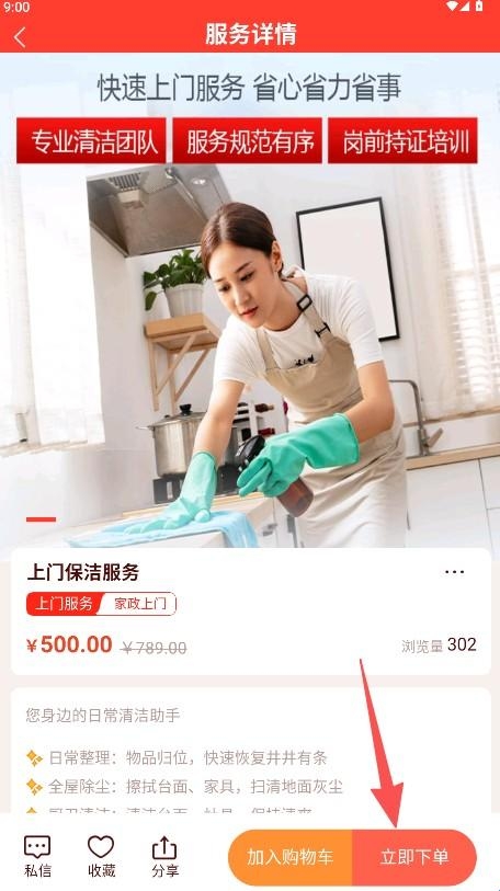 3、在详情页确认服务信息后,点击“立即下单”按钮完成服务预约。
